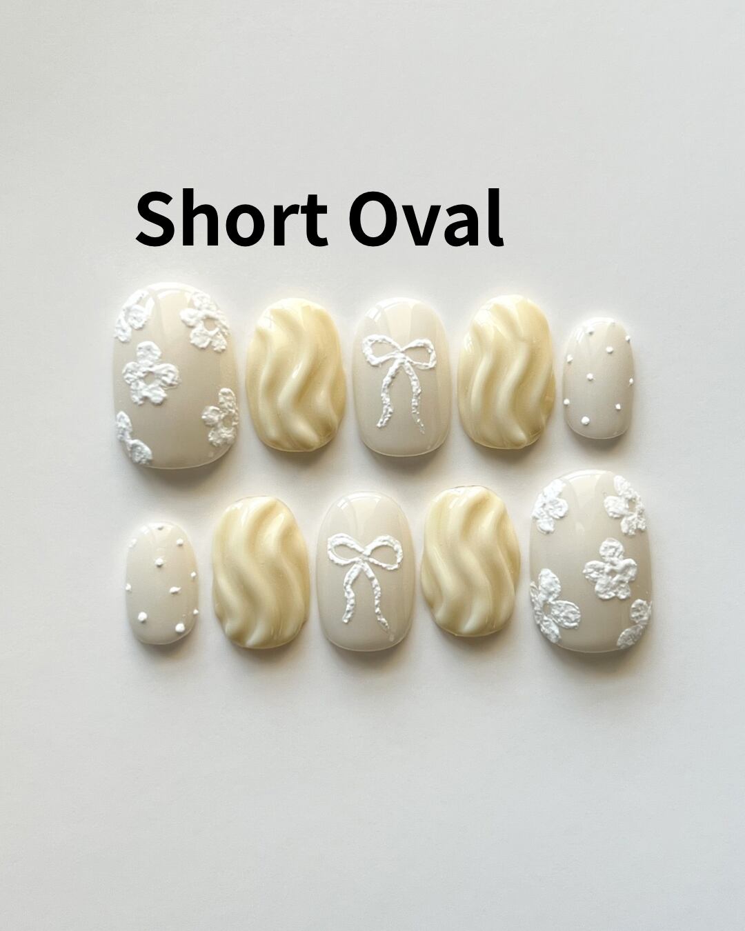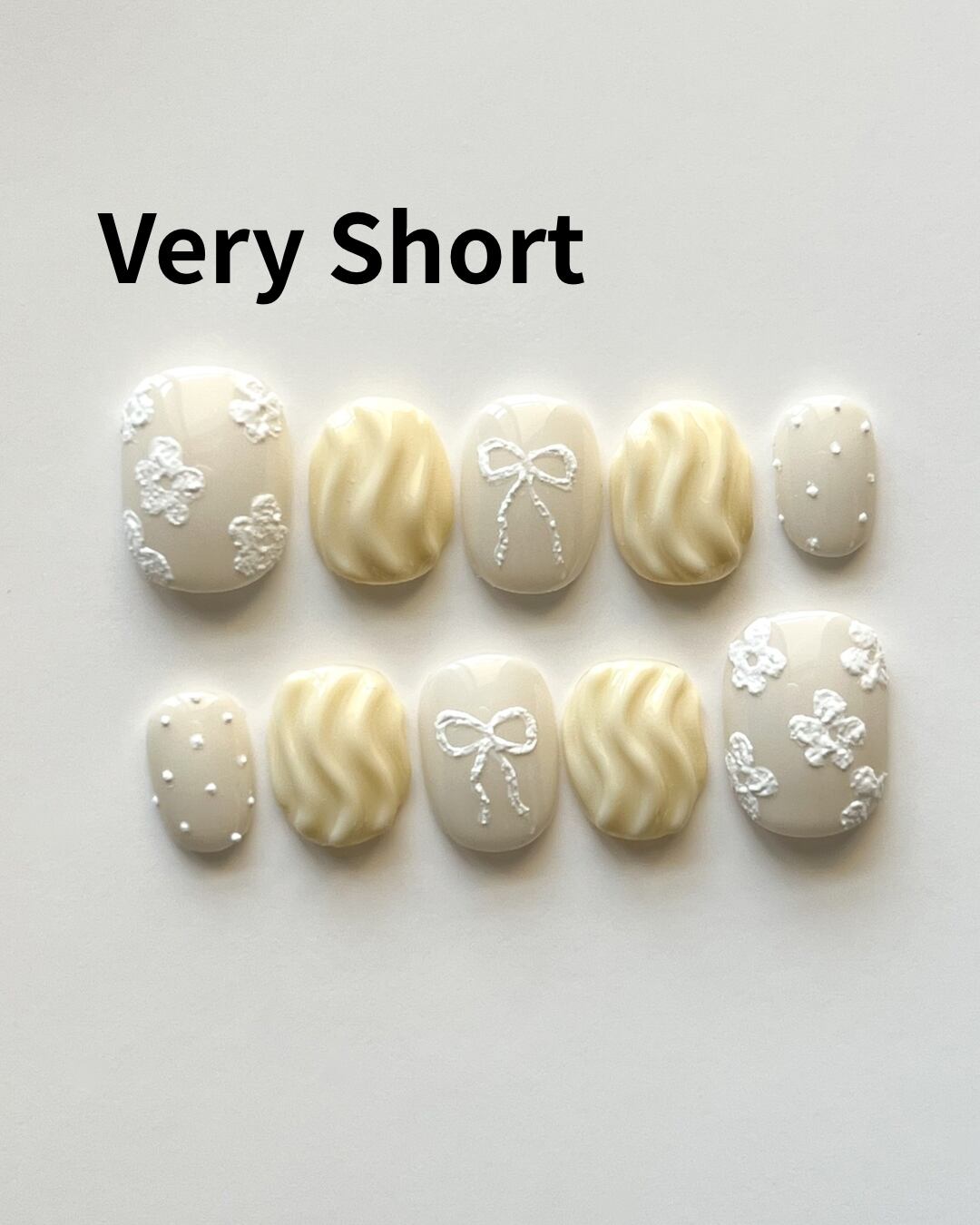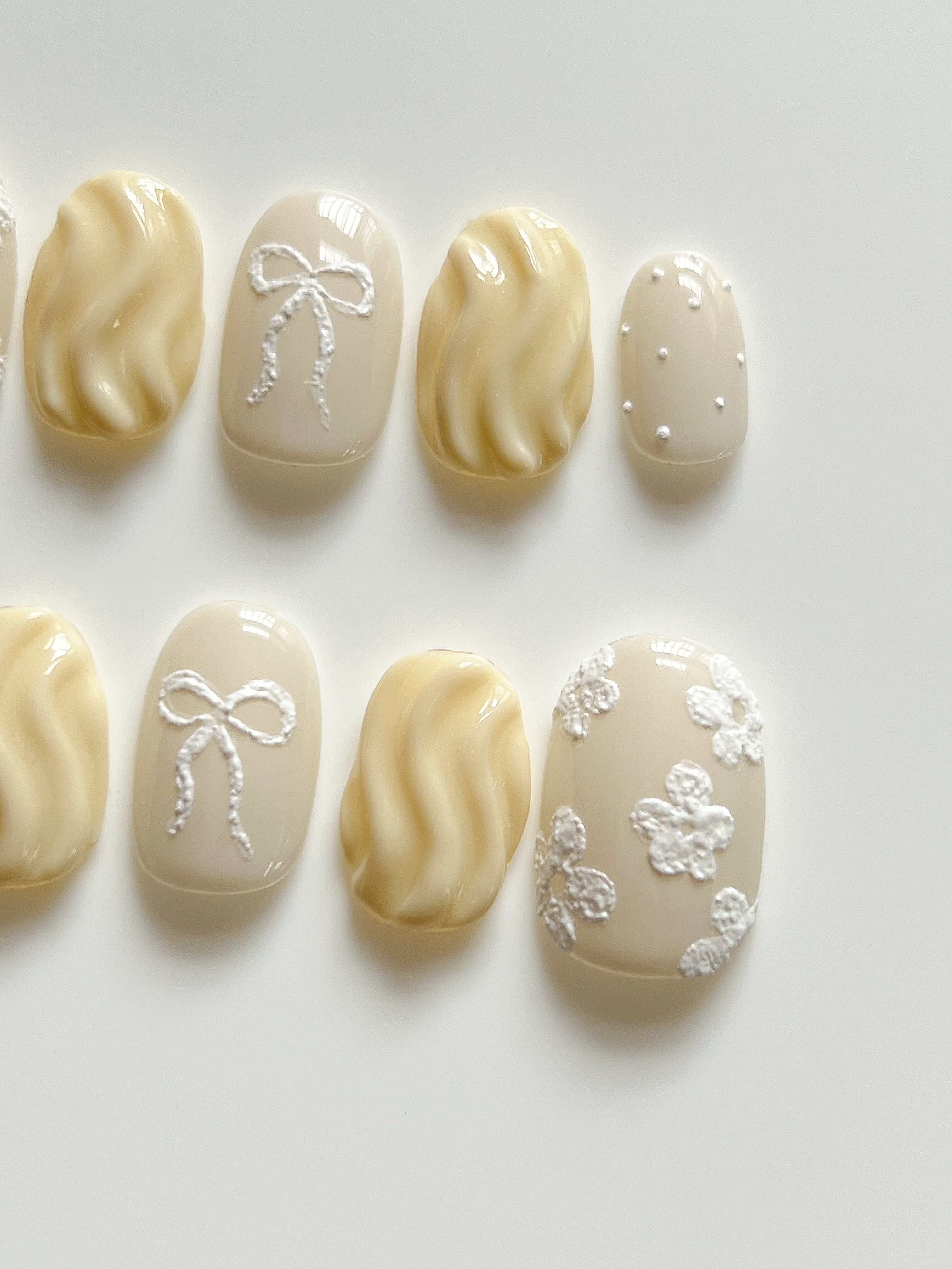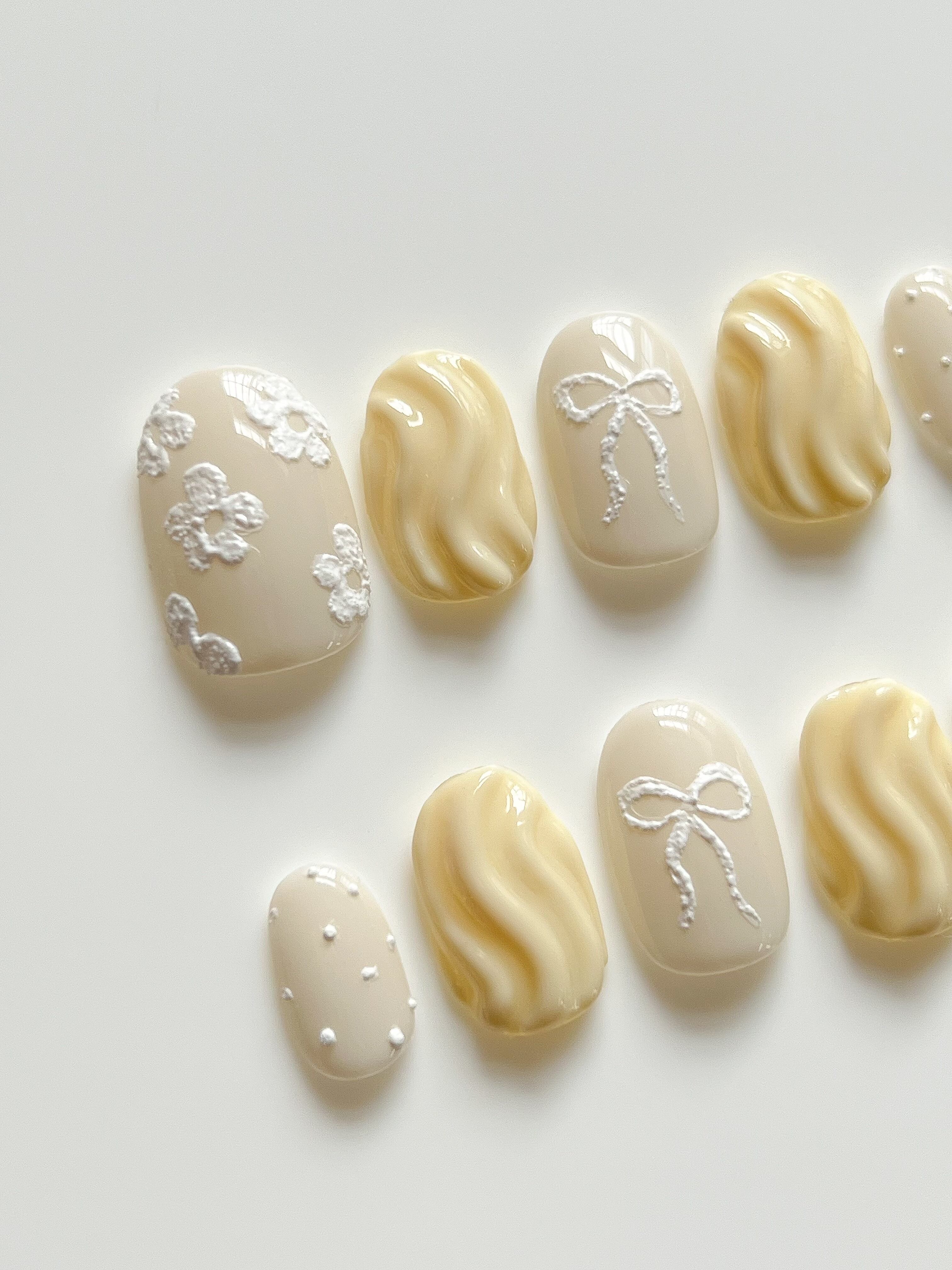 くすみベージュに、立体的な小花とリボンをあしらった、上品でナチュラルなネイルチップです。