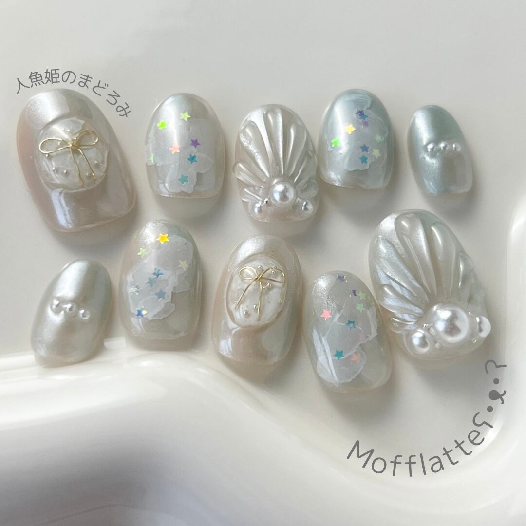 パールのような艶と、貝殻や星のモチーフがポイントのネイルチップです。