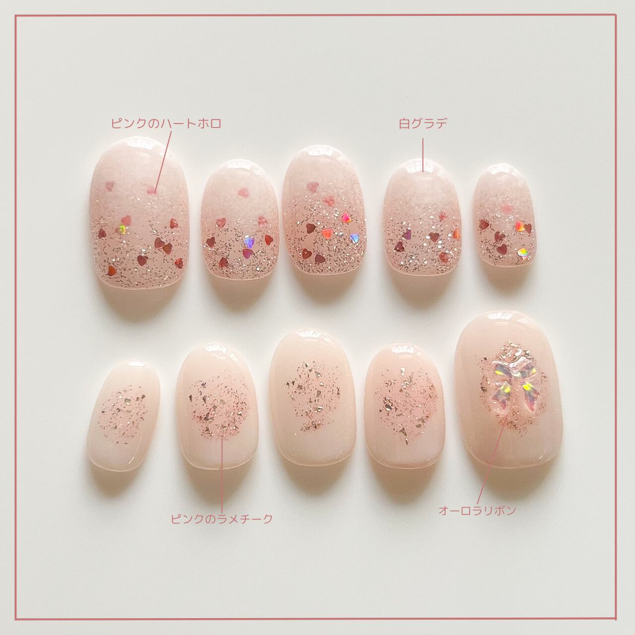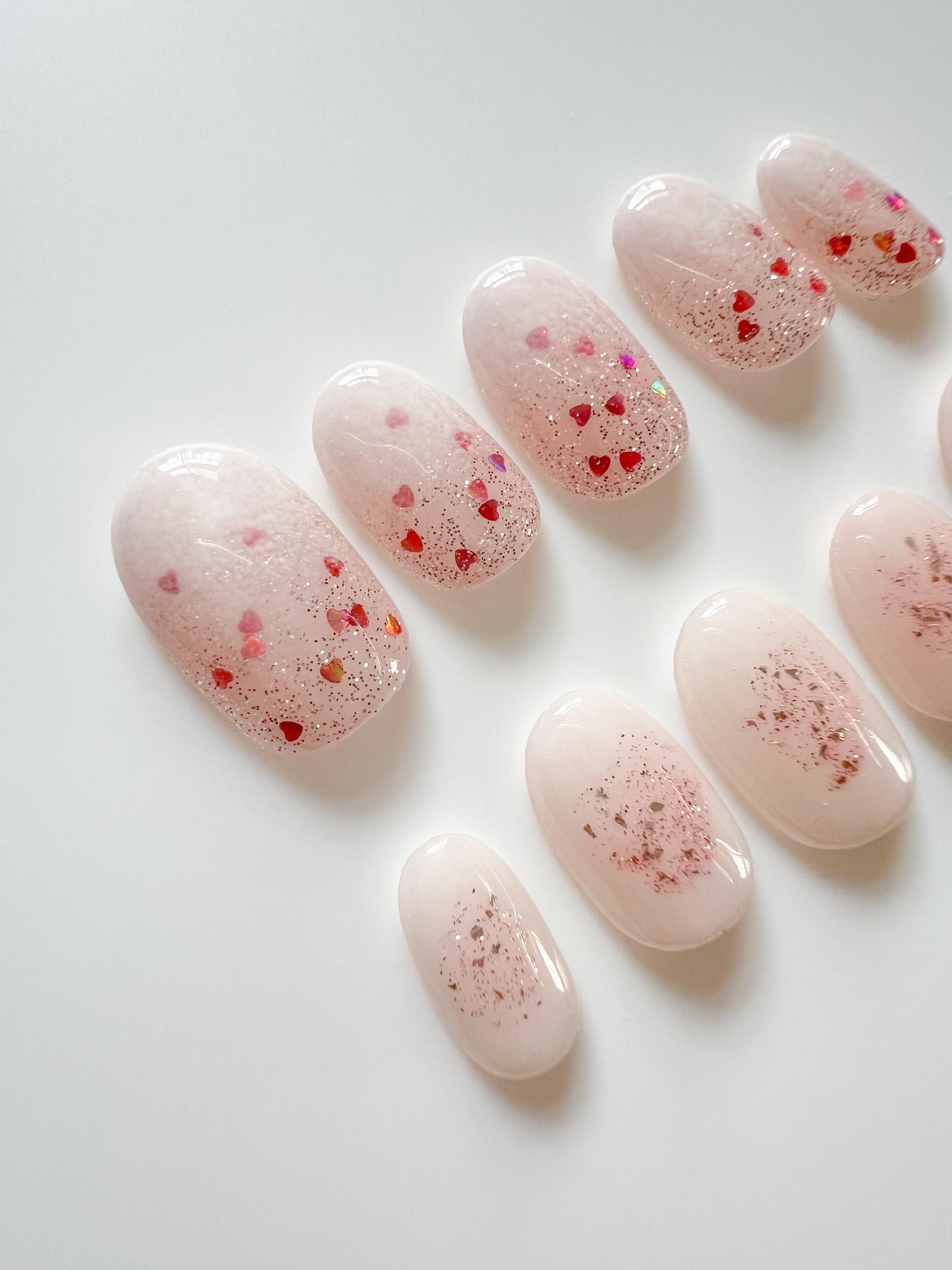 やわらかなミルキーホワイトのグラデーションに、ピンクのハートホロ、微細なピンクラメをたっぷり散りばめました。